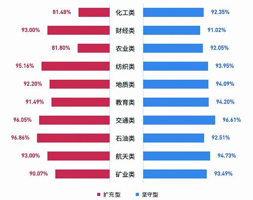与此同时,一些专业在扩充上则显得相对保守。例如,能源动力、汉语言文学、建筑、新闻、管理科学、统计学、仪器等专业虽然具有一定的市场需求,但受行业特点或就业前景的影响,其扩充比例在60%左右;经济学、生物科学、生物工程、社会学等专业则因其专业性较强或就业面较窄,扩充比例在50%至60%。总体来看,行业大学在扩充专业时,既注重与社会发展趋势和市场需求相契合,也充分考虑了院校自身的特点和发展潜力。