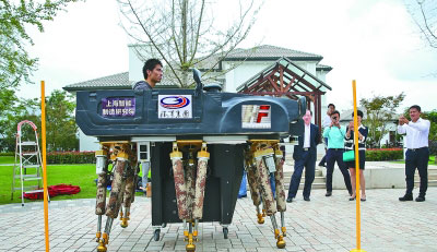一台由某人工智能集团联合上海交通大学共同研发的六足并联步行机器人在上海浦东亮相,并进行了载人绕桩行走演示。新华社记者 裴鑫摄