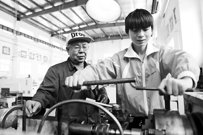 2019年4月,江西省抚州市东乡机电中等专业学校实训楼,数控班学生在技师的指导下学习数控技术。光明图片/视觉中国