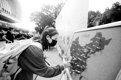 一位来自云南省曲靖市的天津财经大学2021级新生在学院准备的中国地图上标注自己家乡的位置。刘东岳摄/光明图片