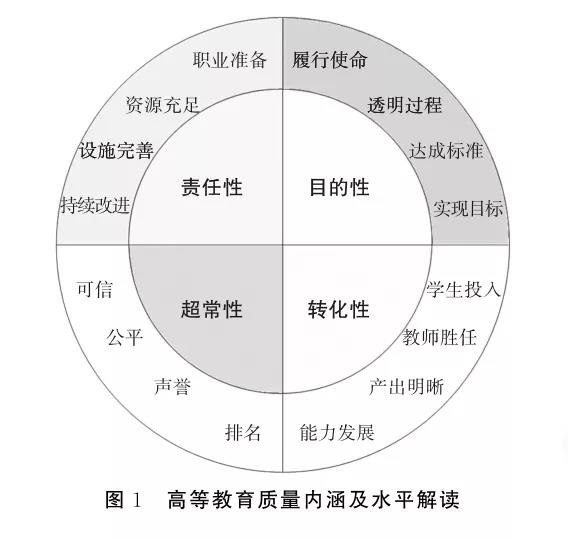 从上述讨论可以看出,不同的人对质量、高等教育质量内涵的理解是非常不同的。高等教育质量是一个很复杂的概念,具有非常丰富的内涵。在这些讨论的基础上,可以从高等教育的目的性、转化性、超常性、责任性四个方面对高等教育质量的内涵及其发展水平作一些解读(详见图1)。
