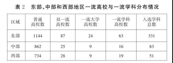 表2简要罗列了我国东部、中部和西部地区一流高校、一流学科的分布情况。这从一个侧面反映了我国优质高等教育资源的区域分布差异程度是很大的。建设高质量高等教育体系,需要切实解决好高等教育区域发展的不平衡、中西部高等教育发展不充分的问题,以便更高效、合理地配置不同地区的高等教育资源,尤其要支持中西部高等教育发展和提质增效。在省域内,也要解决好省会城市与非省会城市的高等教育协调发展问题。不同层次、不同学科专业类别的高等教育也要形成协调发展的新格局。