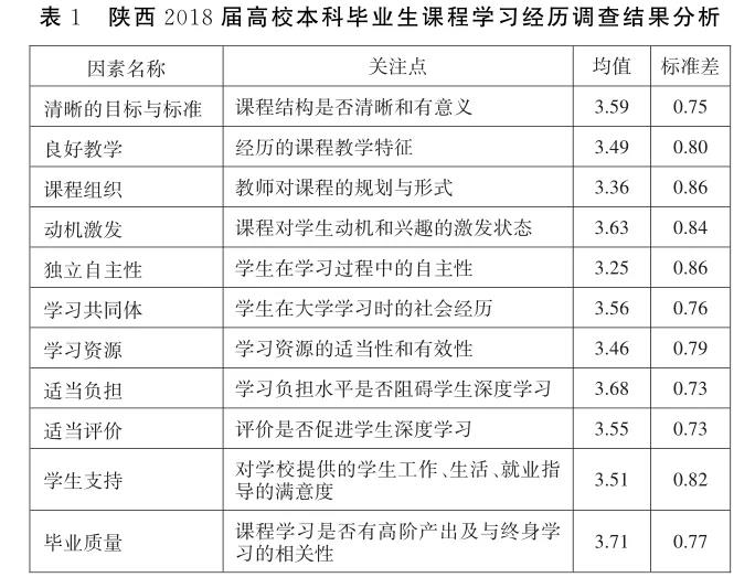 陕西高校2018届本科毕业生共170456人(不包括到军队等国防单位服役等特殊类型的毕业生),其中有44330人回答了调查问卷,有效回收率26.01%。在调查中我们在借鉴Mclnnis等人修订的课程学习经历调查问卷[11]的基础上,引入了自主设计的“课堂学习环境调查问卷”[12]的部分题项,以及有关毕业生对高校教学质量的满意度等。对调查工具信效度分析的结果表明,它能够对高校毕业生的课程学习经历进行科学有效、可靠的测量[13]。毕业生对这些题目的回答分为“非常不同意”“不同意”“不确定”“同意”“非常同意”5 个等级,并分别被赋值为1、2、3、4、5。从表1可见,就整体而言,如果将课程学习经历各维度的满分5分制转换为百分制的100分,则陕西高校本科毕业生在课程学习经历各维度上的平均得分介于65~75分之间。这一状态和高质量高等教育发展要求相比,还存在很大的提升空间。