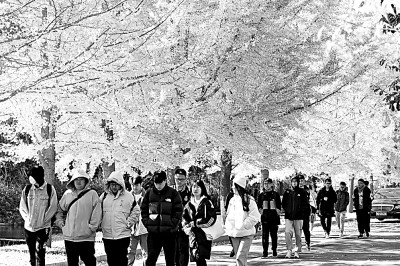 2021年11月8日,位于青岛西海岸新区的山东科技大学,大学生们在金黄的银杏树下行走。俞方平摄/光明图片