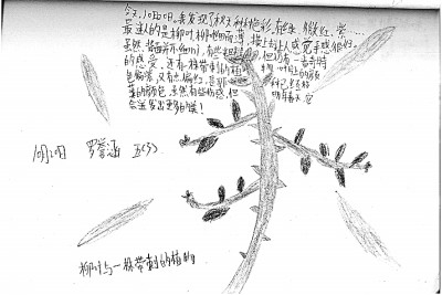 朱爱朝:2013年2月,我开始带二年级三班的学生观察育才学校桃李园中的植物,用图画加文字的自然笔记方式,来观察和记录自然。周复一周的观察,这些曾被小学生熟视无睹的植物,与他们有了生命的连接:他们会为梅树被折断一根小枝而心疼,会为干旱中的植物渴望着一场雨。学生懂得植物需要保护,这只是在理性层面。当学生心疼植物受到伤害的时候,感受层面就启动了,这是学生知行合一、扎下自然根基的开始。