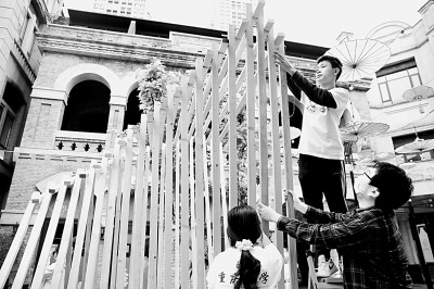 “第九届重庆大学建造季”在重庆市渝中区白象街传统风貌区举行,图为重庆大学建筑城规学院学生正在搭建建筑作品。赵杰昌摄/光明图片