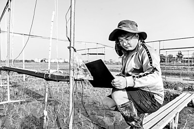江西农业大学研究生在田间做增温与播期对双季稻产量和温室气体排放影响的研究。周亮摄/光明图片