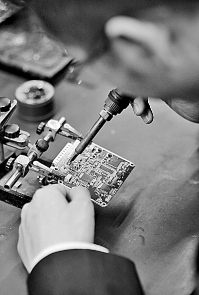 中国铁路成都局集团有限公司科学技术研究所研发二部部长、工程师黄园刚在实验室内焊接电子元器件。新华社发