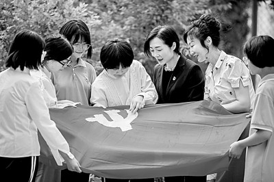 6月29日,内蒙古呼和浩特市第二十六中学师生共同绣制党旗。丁根厚摄/光明图片