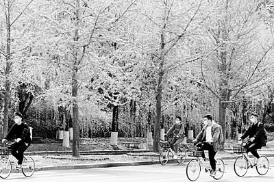 4月14日,山东科技大学学生在春光明媚的校园中骑行。俞方平摄/光明图片