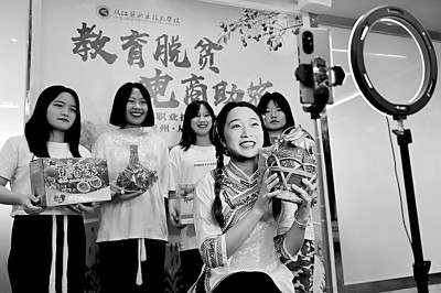 6月17日,学生在贵州省黔东南苗族侗族自治州从江县职业技术学校电商专业实训室进行直播带货实操训练。龙梦前摄/光明图片