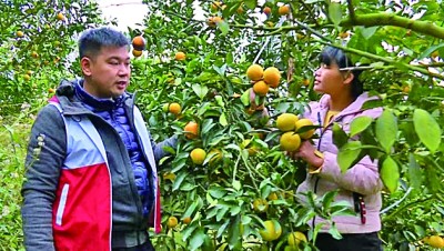 林舒进(左)同石茅村柑橘果农交流。 受访者供图