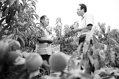 甘肃农业大学农学专业毕业的方志利(右)和村民交流桃子采摘情况。新华社发