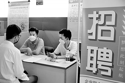 求职大学生在苏州市高校毕业生专场招聘会上与工作人员洽谈。 王建康摄/光明图片