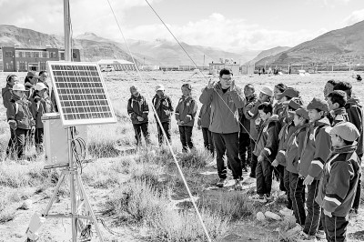 5月15日,珠峰站工作人员席振华给孩子们讲解科学仪器的功能作用。新华社发
