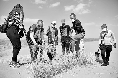 6月16日,来自泰国、也门、伊朗、坦桑尼亚等14个国家的30余名宁夏医科大学国际教育学院留学生在宁夏灵武市白芨滩国家级自然保护区感受中国治沙成就。图为留学生们跟随保护区职工学扎草方格。新华社发