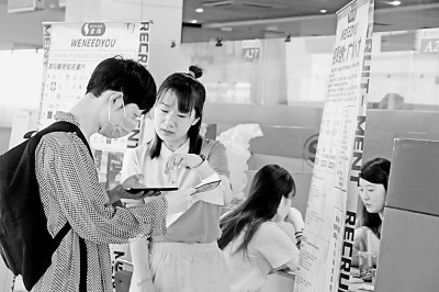 7月3日,求职者在“就在苏州·留在苏州”高校毕业生公益专场招聘会上与工作人员交流。王建康摄/光明图片