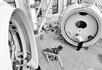 9月13日,中国船舶集团旗下中船海装大连公司的装配工在进行海上风电机组变桨集中润滑工作。新华社发