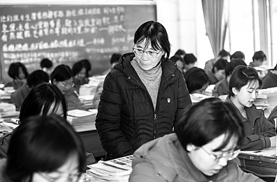 云南丽江华坪女子高级中学校长张桂梅在教室里检查学生上课情况。 新华社发
